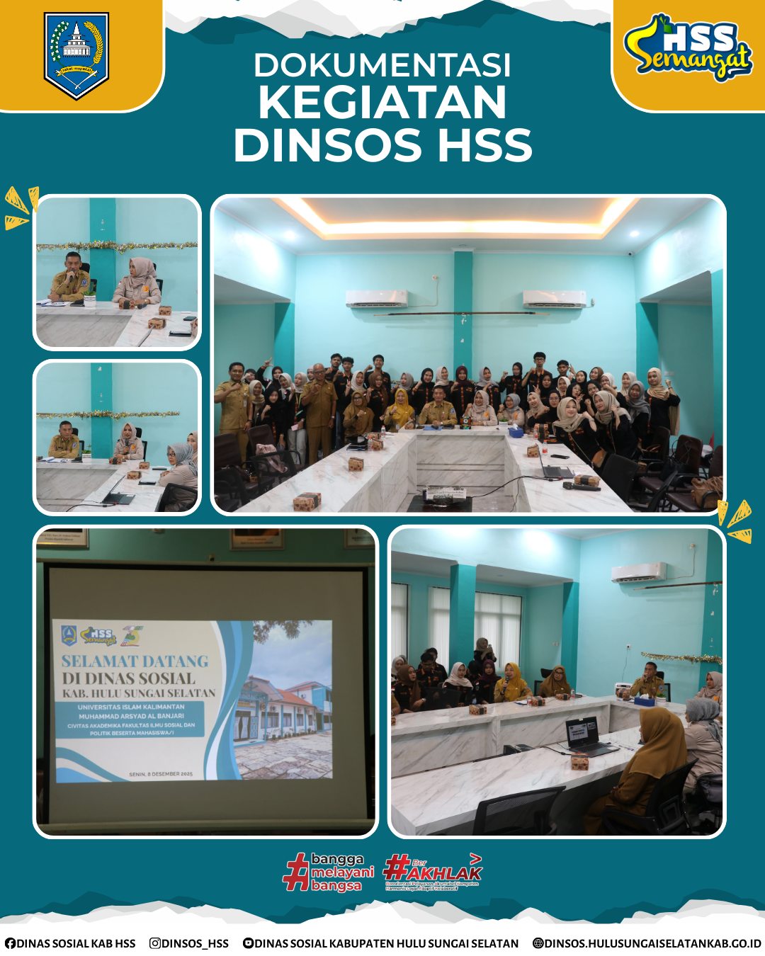 Senin, 08 Desember 2025 – Program Studi Ilmu Administrasi Publik, Fakultas Ilmu Sosial dan Ilmu Politik (FISIP) Universitas Islam Kalimantan Muhammad Arsyad Al Banjari (UNISKA MAB) melakukan kunjungan resmi ke Kantor Dinas Sosial Kabupaten Hulu Sungai Selatan.