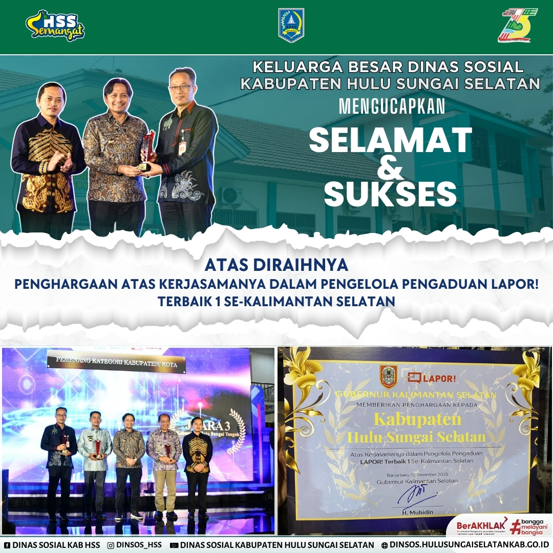 Keluarga Besar Dinas Sosial Kabupaten Hulu Sungai Selatan menyampaikan Selamat & Sukses kepada Pemerintah Kabupaten Hulu Sungai Selatan atas diraihnya Penghargaan Kerjasama Pengelolaan Pengaduan LAPOR! Terbaik 1 se-Kalimantan Selatan