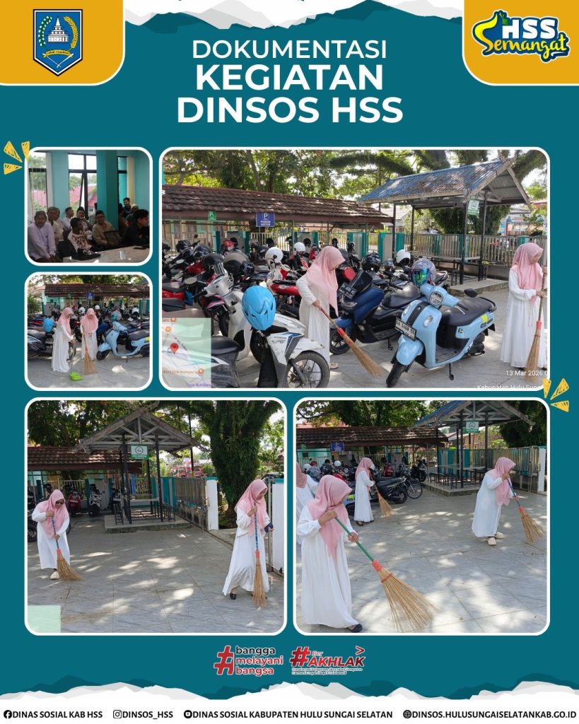 𝐇𝐮𝐥𝐮 𝐒𝐮𝐧𝐠𝐚𝐢 𝐒𝐞𝐥𝐚𝐭𝐚𝐧, 𝟏𝟑 𝐌𝐚𝐫𝐞𝐭 𝟐𝟎𝟐𝟔 – Dinas Sosial Kabupaten Hulu Sungai Selatan mengisi hari Jum’at dengan rangkaian kegiatan yang menyentuh aspek lingkungan dan spiritual. Kegiatan dimulai dengan 𝐁𝐞𝐫𝐬𝐢𝐡 𝐇𝐚𝐥𝐚𝐦𝐚𝐧 𝐊𝐚𝐧𝐭𝐨𝐫 secara gotong royong untuk menciptakan lingkungan pelayanan yang asri, bersih, dan nyaman bagi masyarakat.