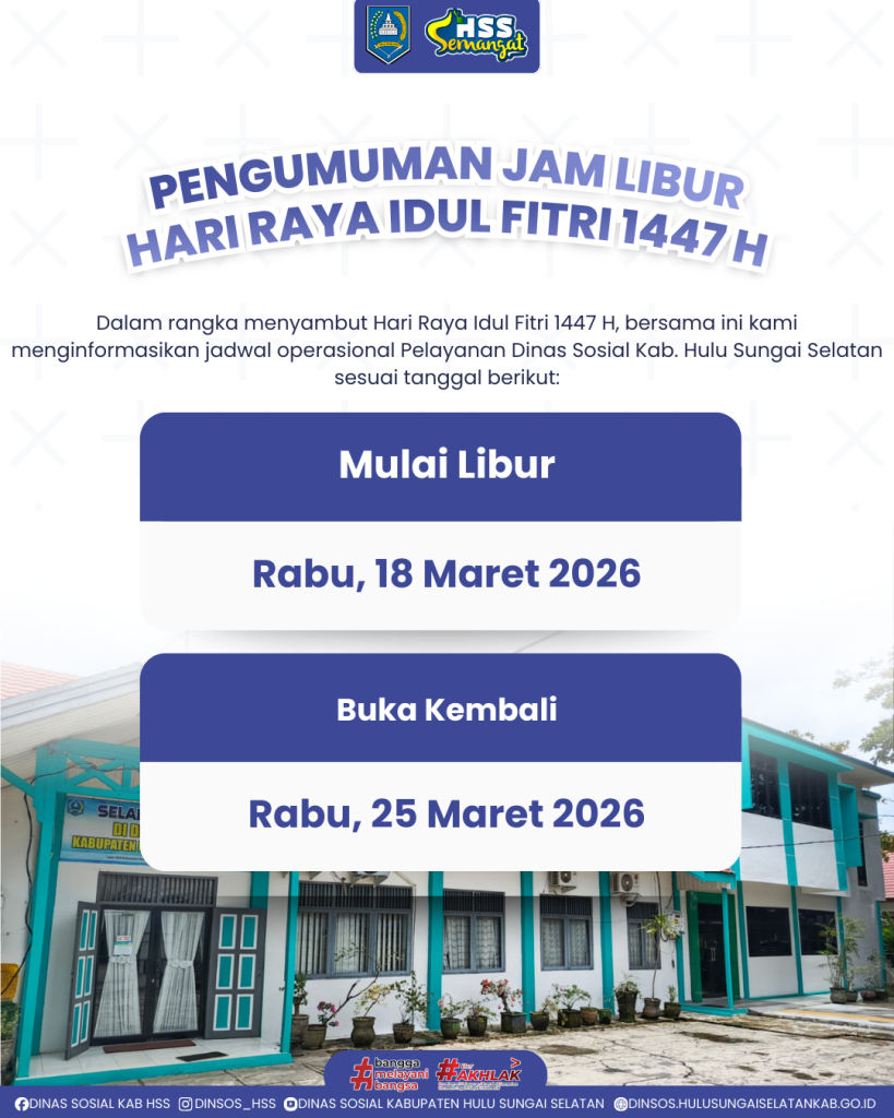 𝐇𝐮𝐥𝐮 𝐒𝐮𝐧𝐠𝐚𝐢 𝐒𝐞𝐥𝐚𝐭𝐚𝐧, 𝟏𝟖 𝐌𝐚𝐫𝐞𝐭 𝟐𝟎𝟐𝟔-Dalam rangka menyambut Hari Raya Idul Fitri 1447 H, Dinas Sosial Kabupaten Hulu Sungai Selatan menginformasikan penyesuaian jadwal operasional pelayanan kepada seluruh masyarakat.